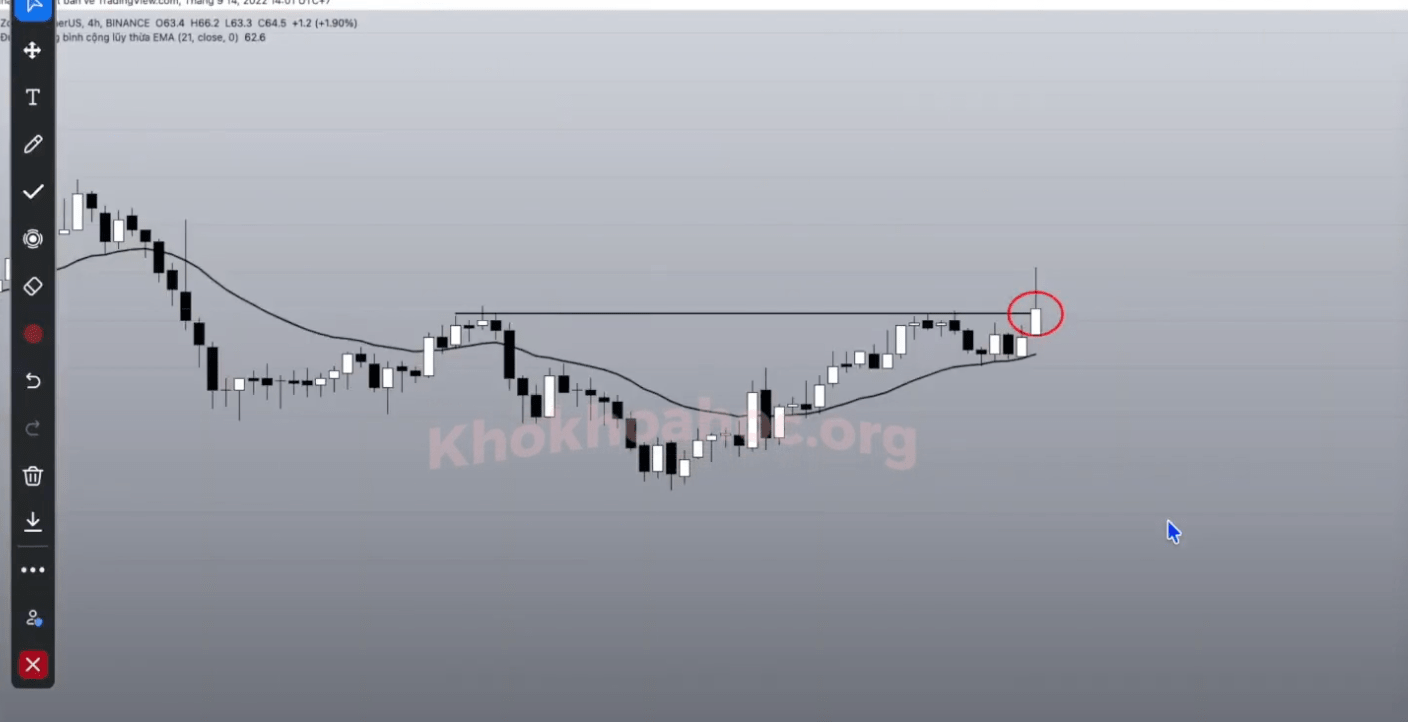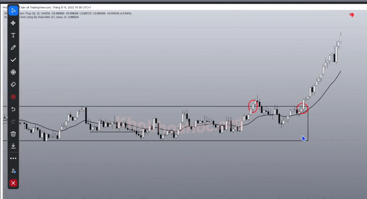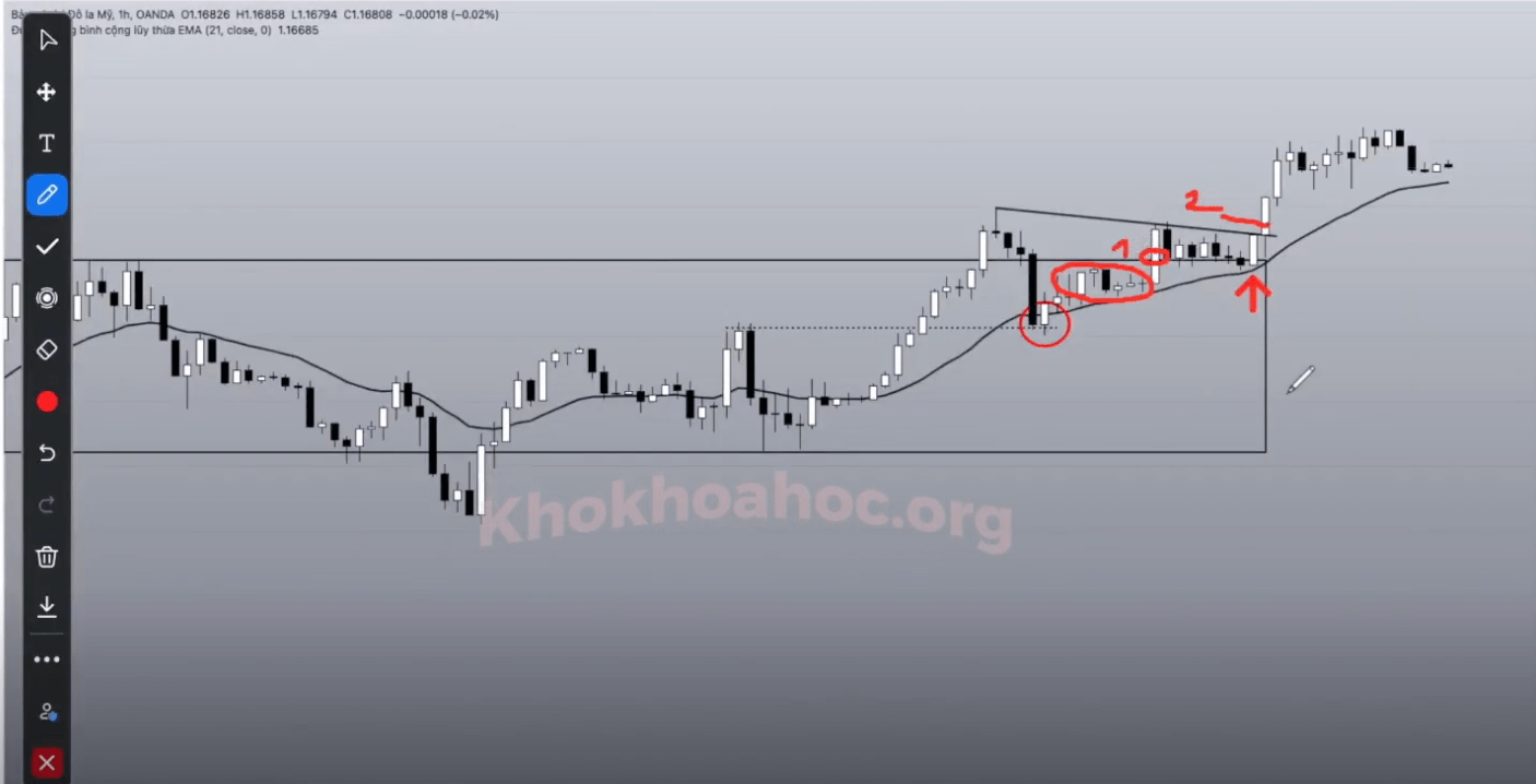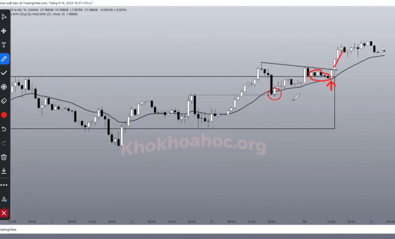 Trước khi phá vỡ, giá có sự tiếp cận đường biên kháng cự và tạo ra nến tích luỹ.