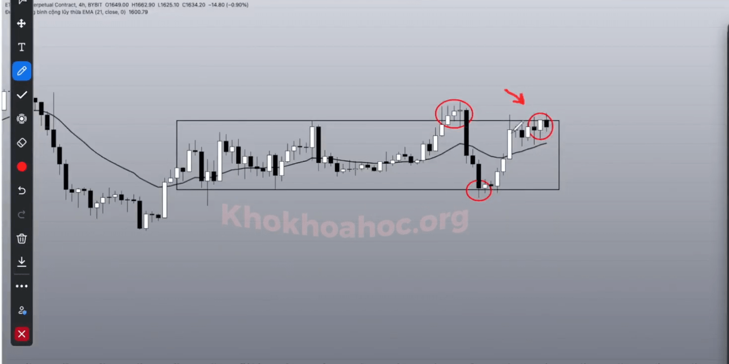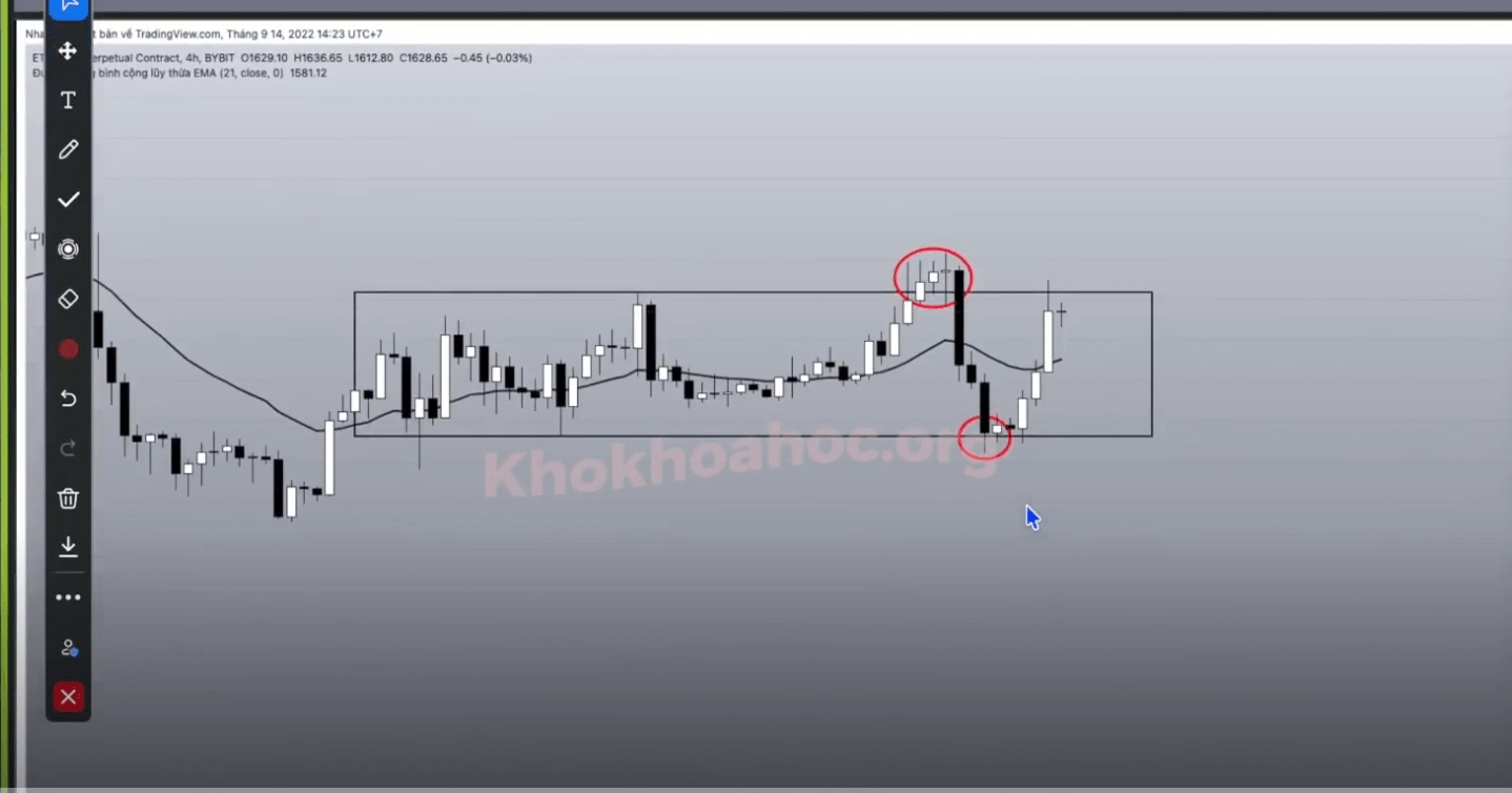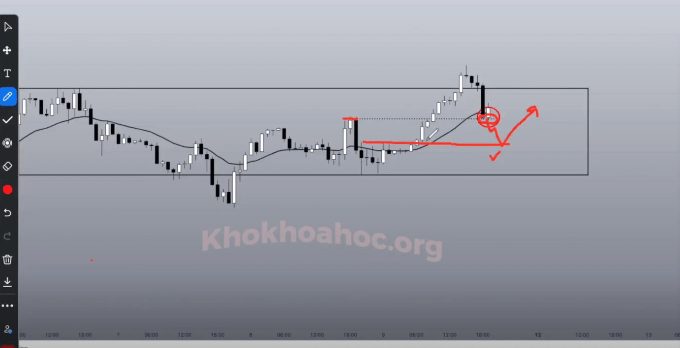 Khi giá bật lại chạm khung, đây là điểm mua. Cú chạm lại trần tại đỉnh tích luỹ gần nhất là điểm cộng, không phải tiên quyết.