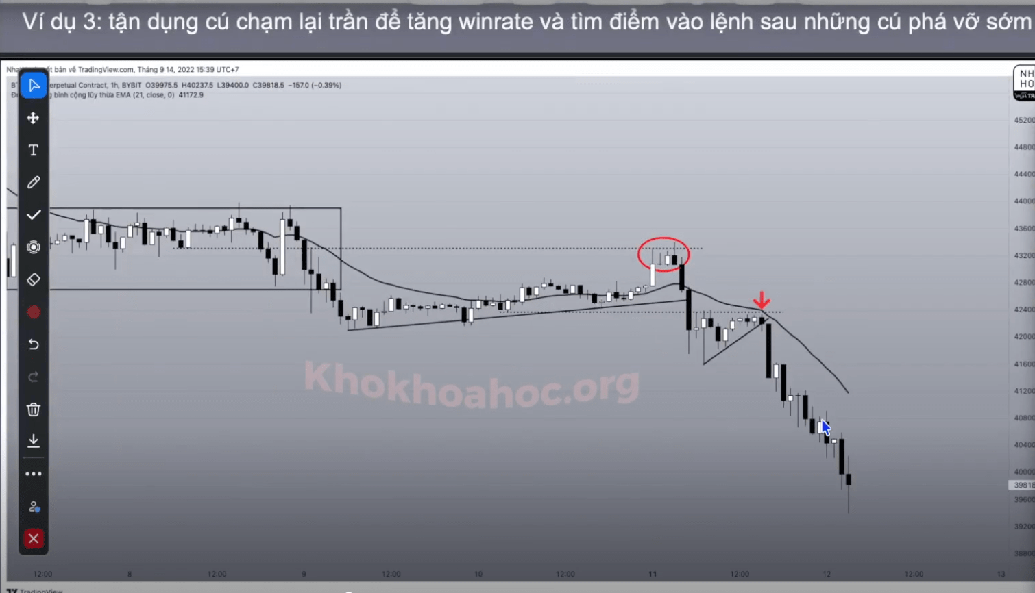 Phá vỡ mồi (m) làm giá tăng trở lại vào vòm - là điểm tích luỹ gần nhất, sau đó nếu giá giảm, giảm qua khung thì đây là điểm SELL. Điểm số 2 là điểm chạm trần, là 1 điểm cộng, không phải tiên quyết.